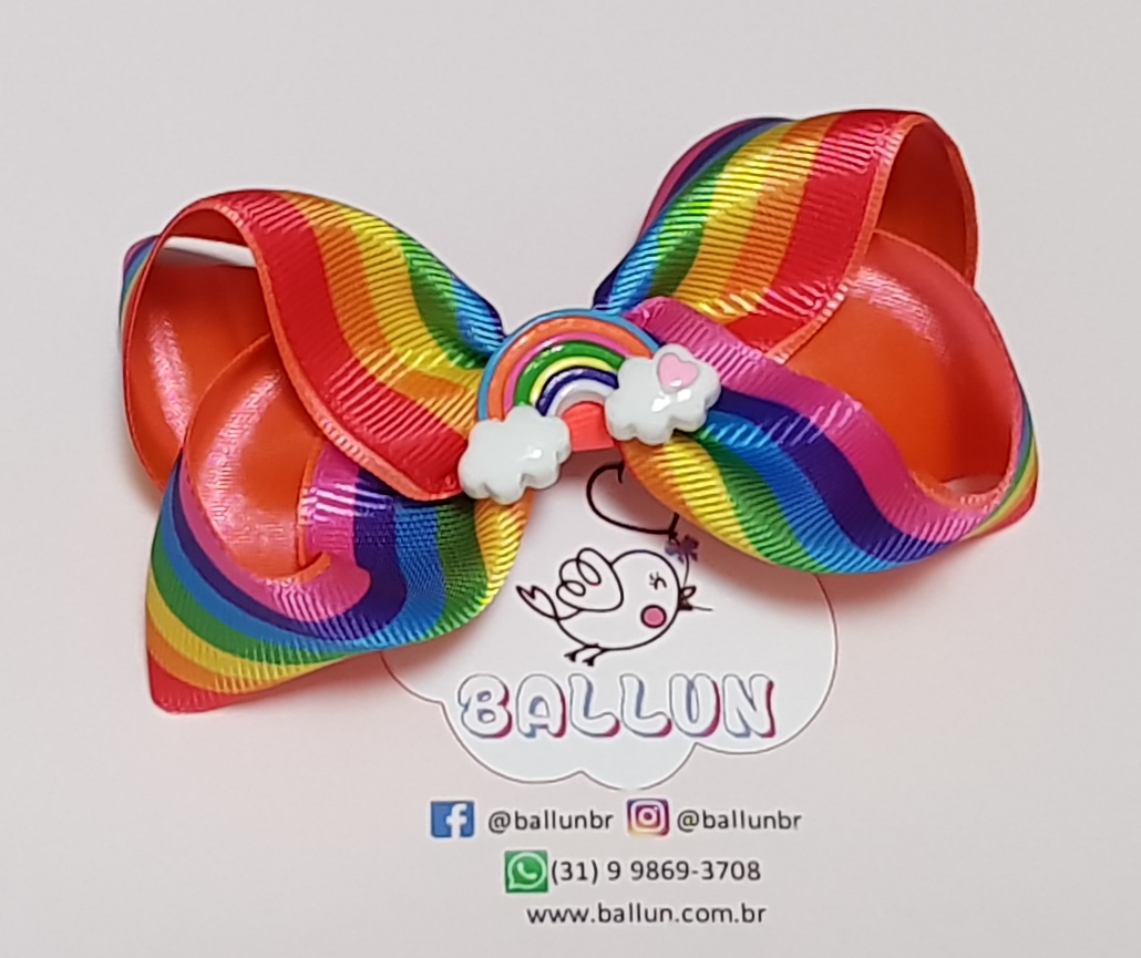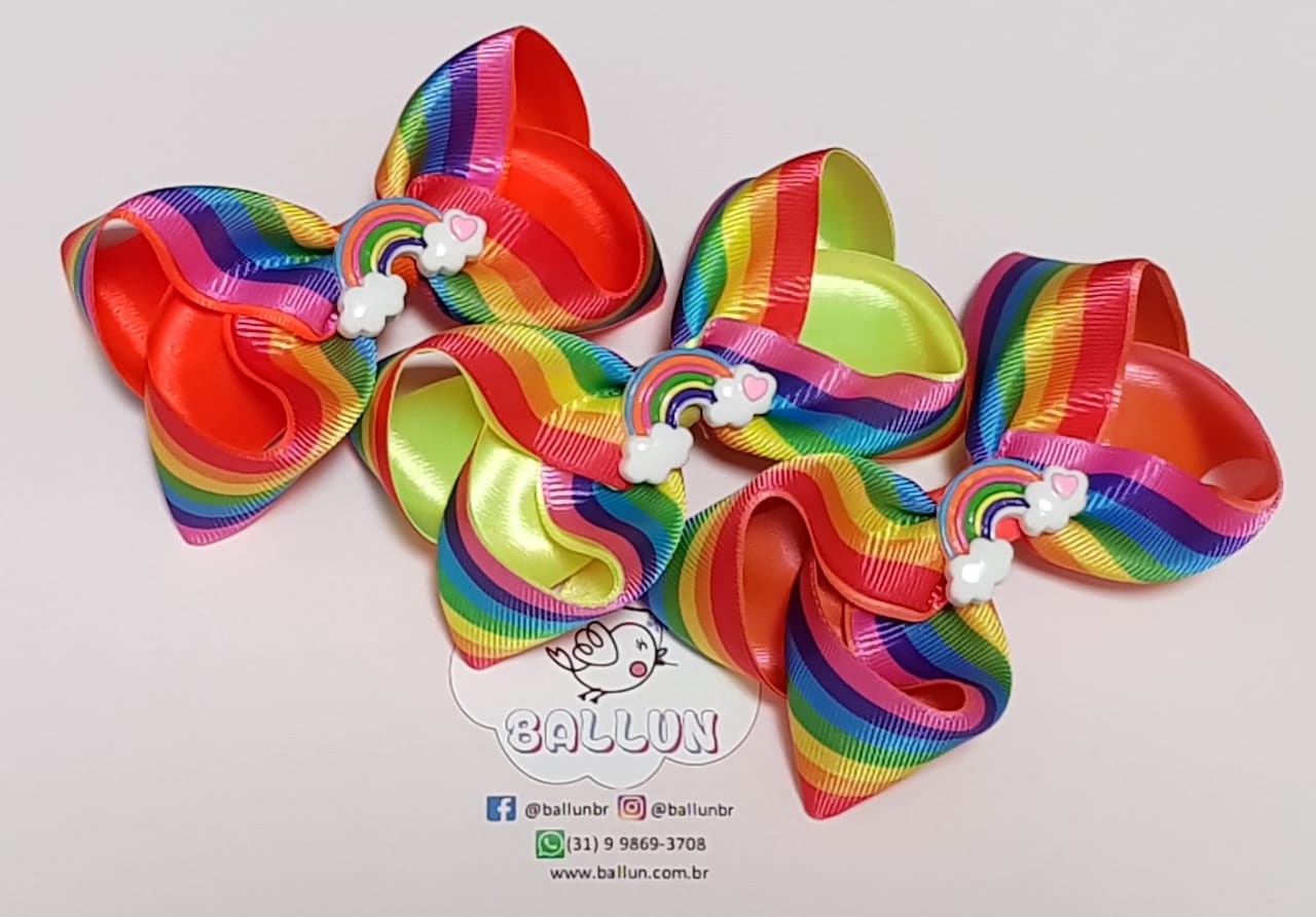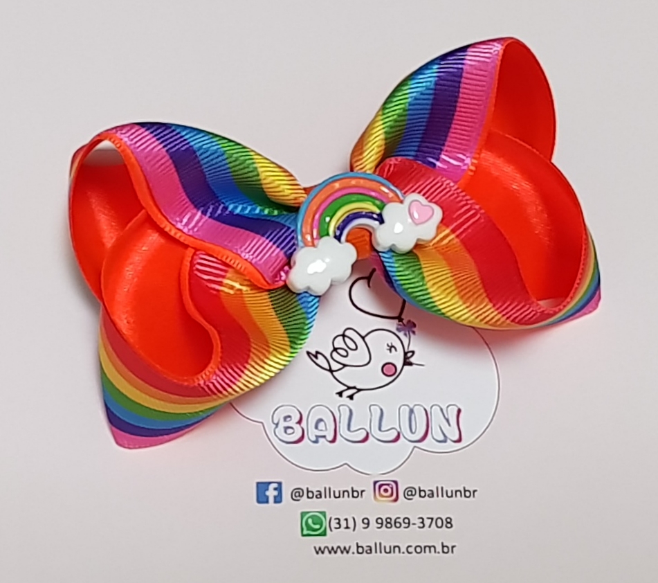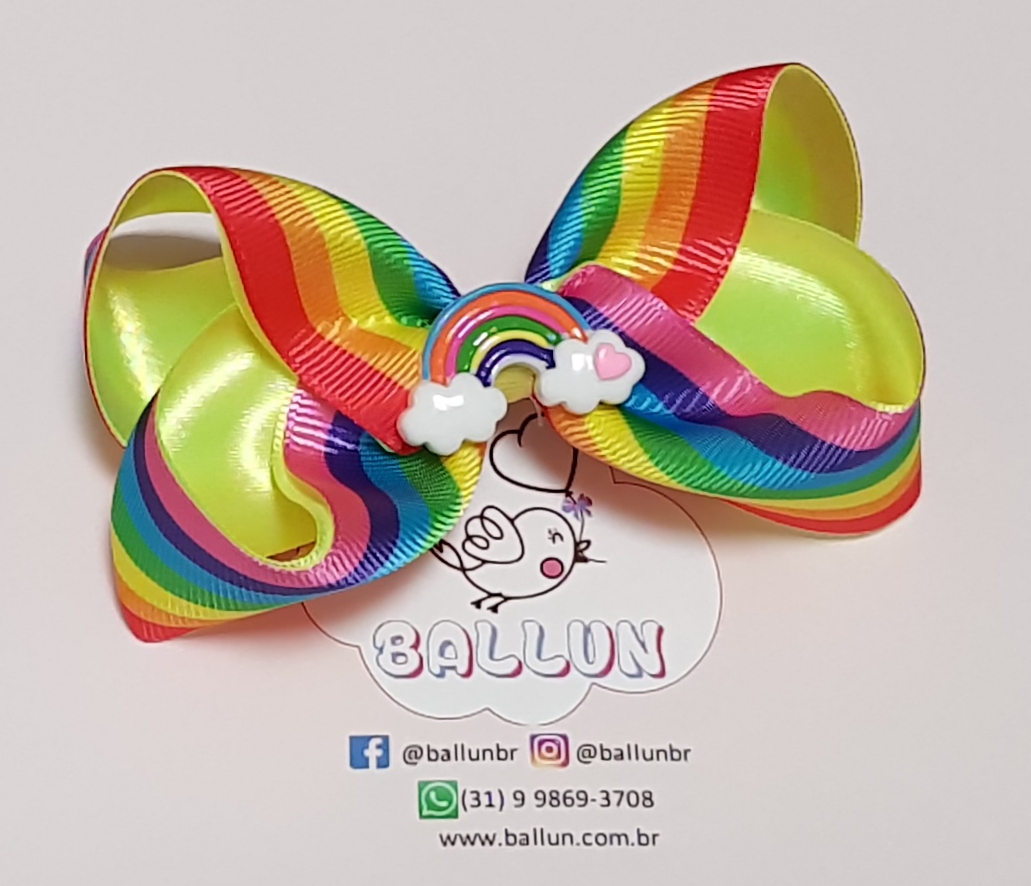 Laço feito em fita de gorgorão multicolorida e fitas de fundo em cores neon, com aplique central.