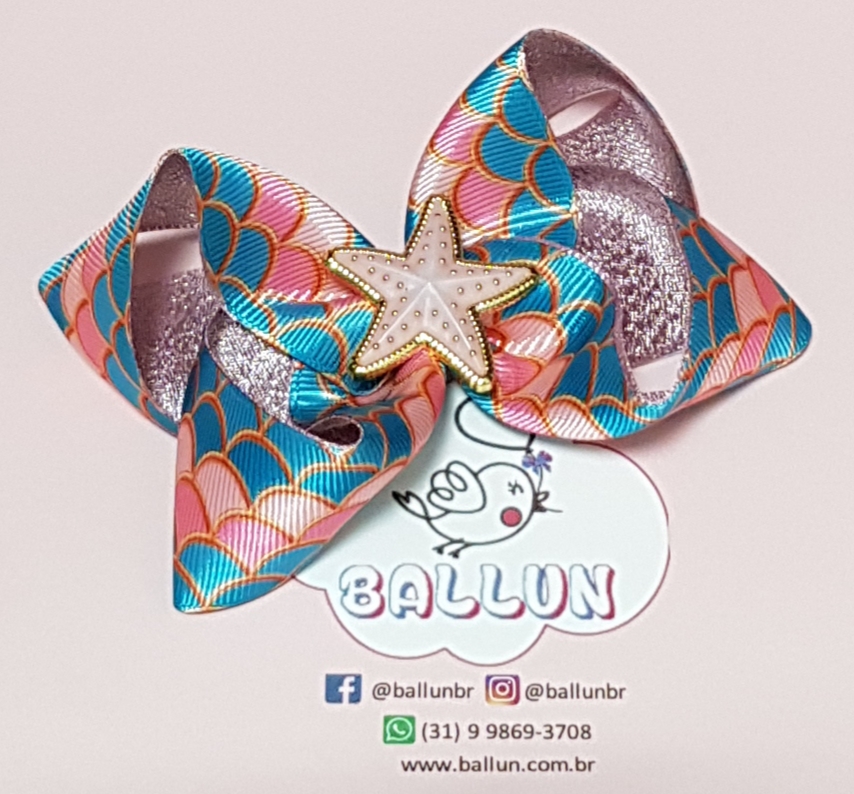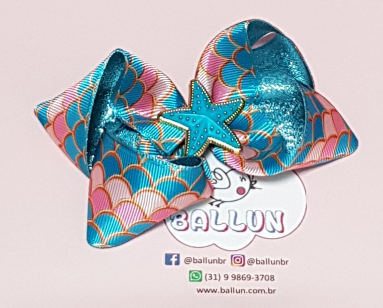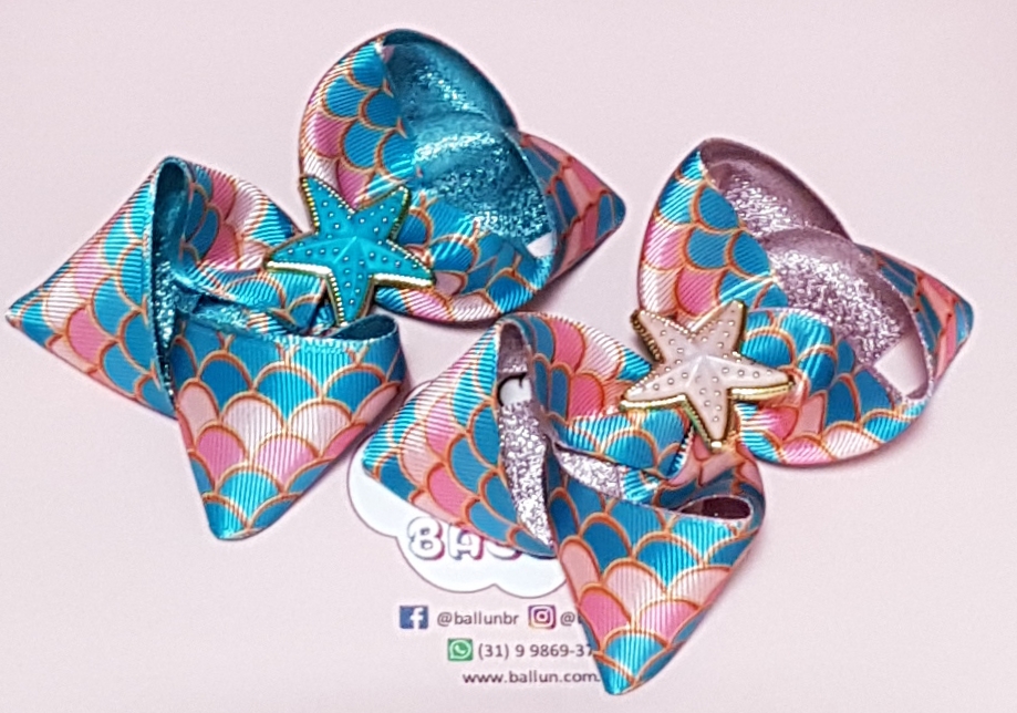 Laço feito com gorgorão importado com estampa de escamas e fita de cetim com brilho. Aplique central em estrela do mar.