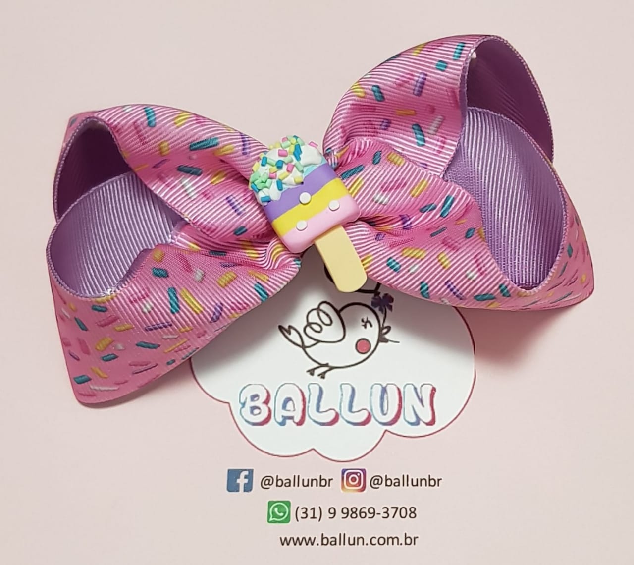Laço feito em gorgorão estampado e liso, com aplique central de picolé.